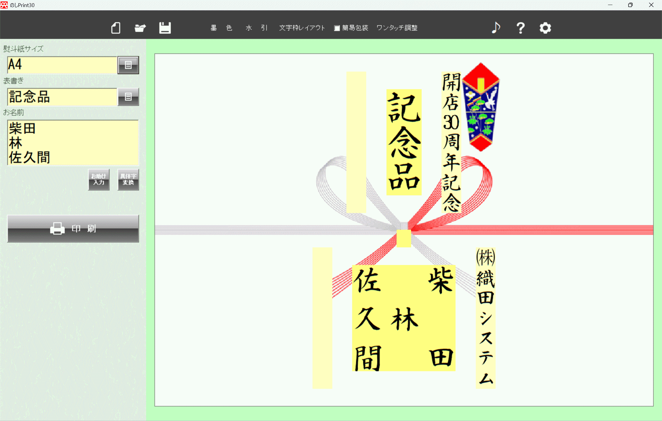 ・簡易包装印刷機能(包装紙と熨斗紙を1枚に印刷)