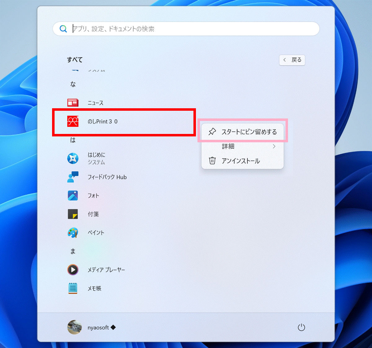 ![]() スタートメニューの右上の[すべて]をクリック ![]() アプリをダブルクリックで起動できます また、右クリックしてスタートメニューへピン留めもできます ![]() スタートメニューへピン留めしました |