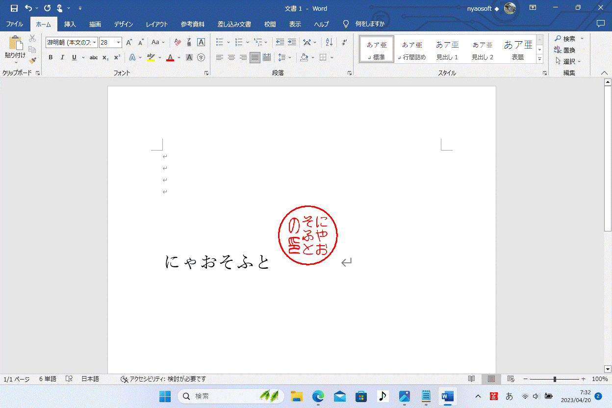 ワードに貼り付けた状態(この状態ですと文字に判子が重なりません)