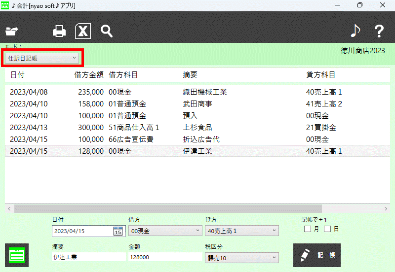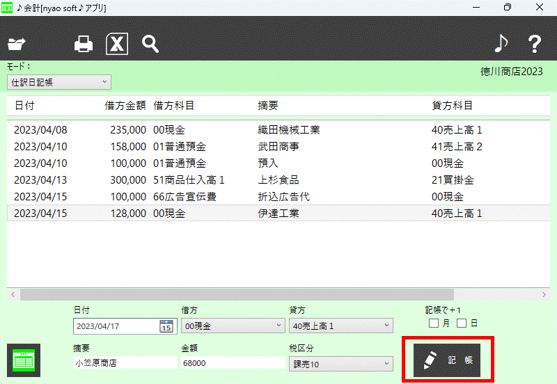 日付欄、[Tab]キー、借方欄、[Tab]キー、貸方欄、[Tab]キー、摘要、[Tab]キー、金額、[Tab]キー、税区分、[Tab]キーで記帳ボタンにフォーカスが移りますので、[Enter]キーを押すと帳面に記帳されます。